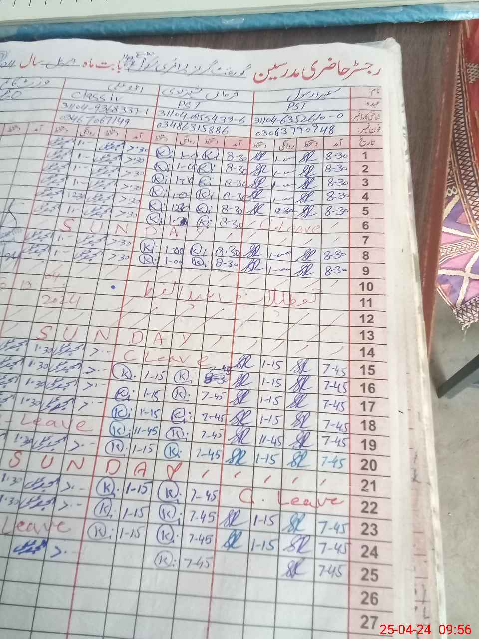 | CNIC | Full Name | Designation | R/C | Absence During Last Calender Month |