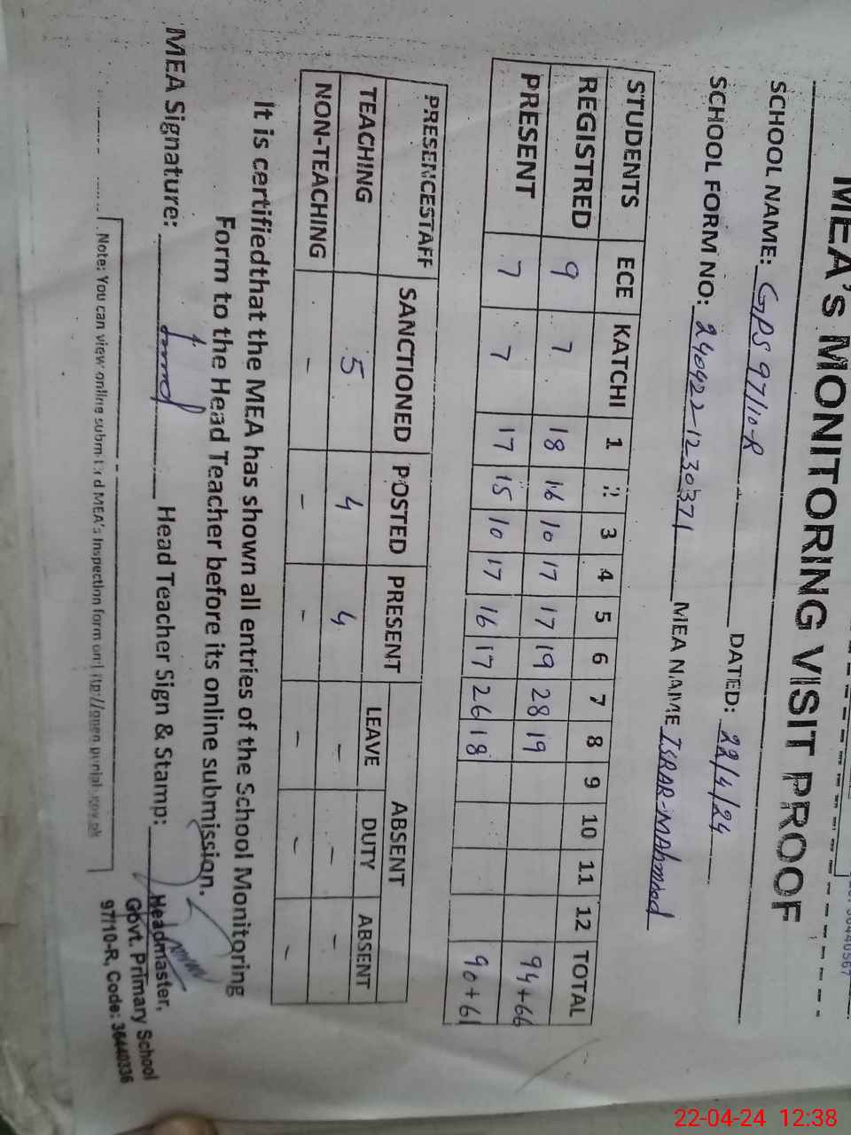 | Attendance Register | Head Teacher | MEA with School | Visit Proof |