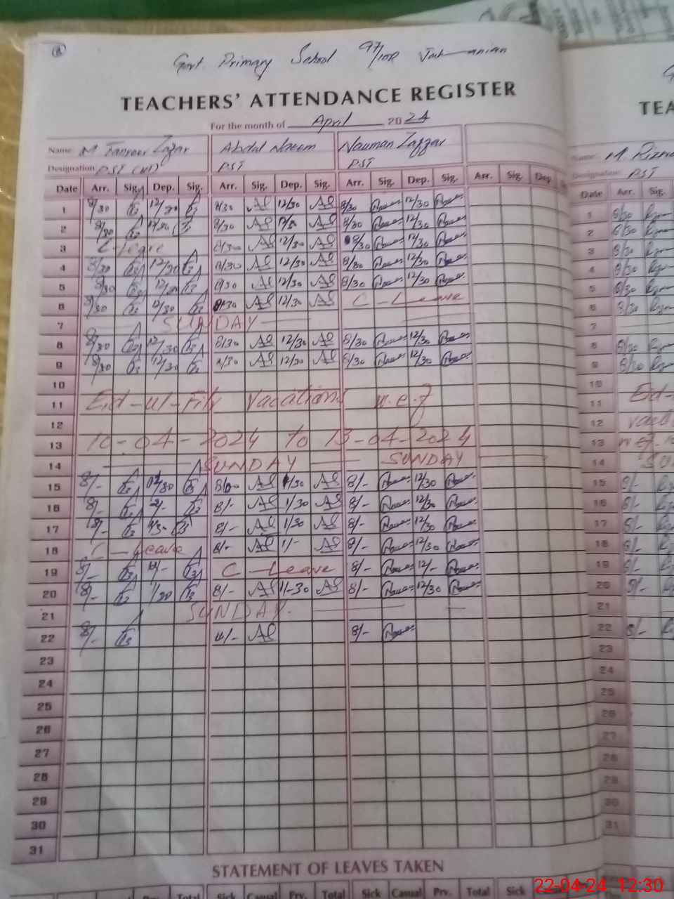 | CNIC | Full Name | Designation | R/C | Absence During Last Calender Month |