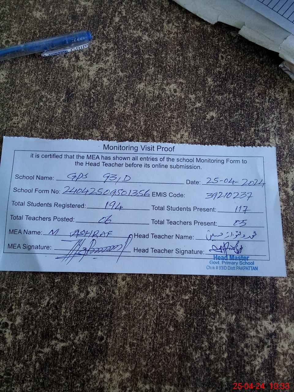 | EMIS Code: 39210237 | Name of School: GPS 93/D | |||