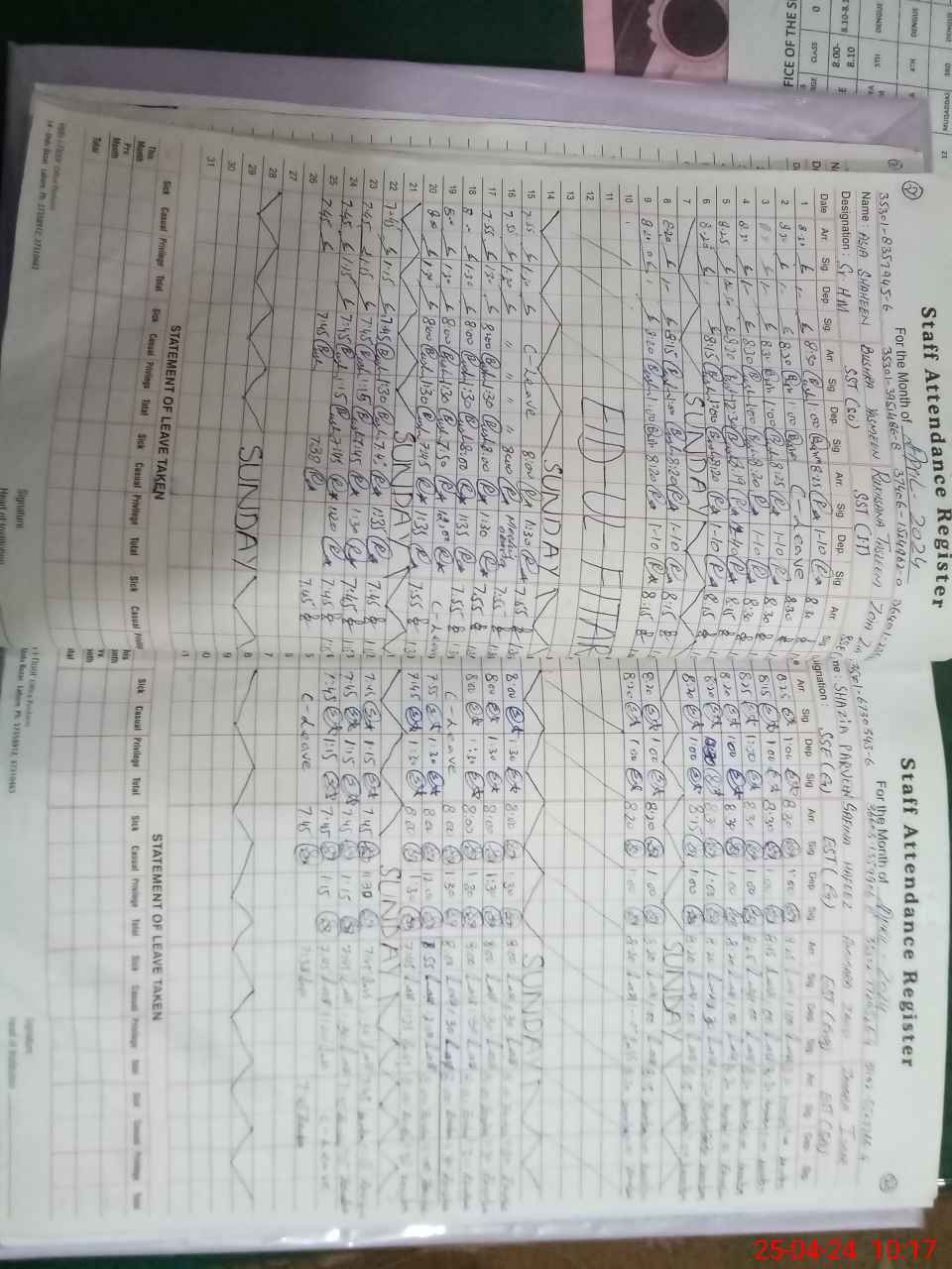 | CNIC | Full Name | Designation | R/C | Absence During Last Calender Month |