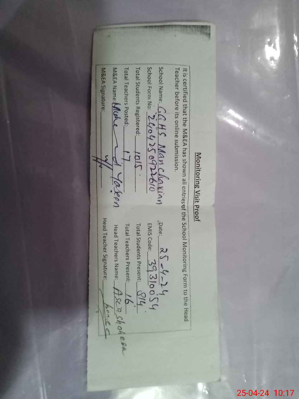 | Attendance Register | Head Teacher | MEA with School | Visit Proof |