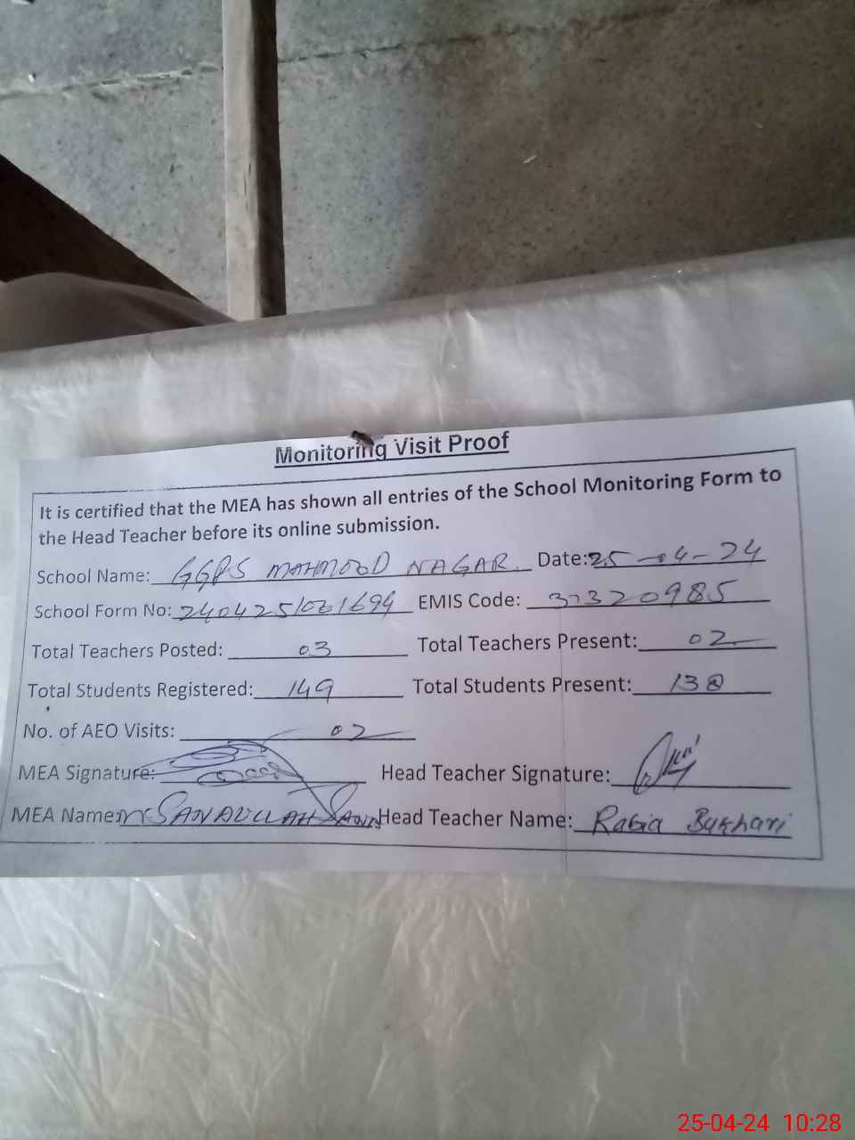 | EMIS Code: 31320985 | Name of School: GGPS MAHMOOD NAGAR | |||