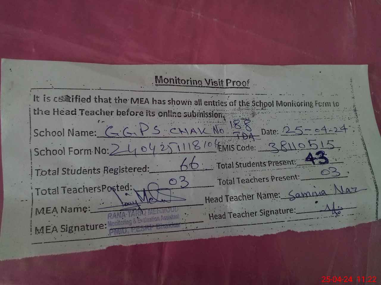 | Attendance Register | Head Teacher | MEA with School | Visit Proof |