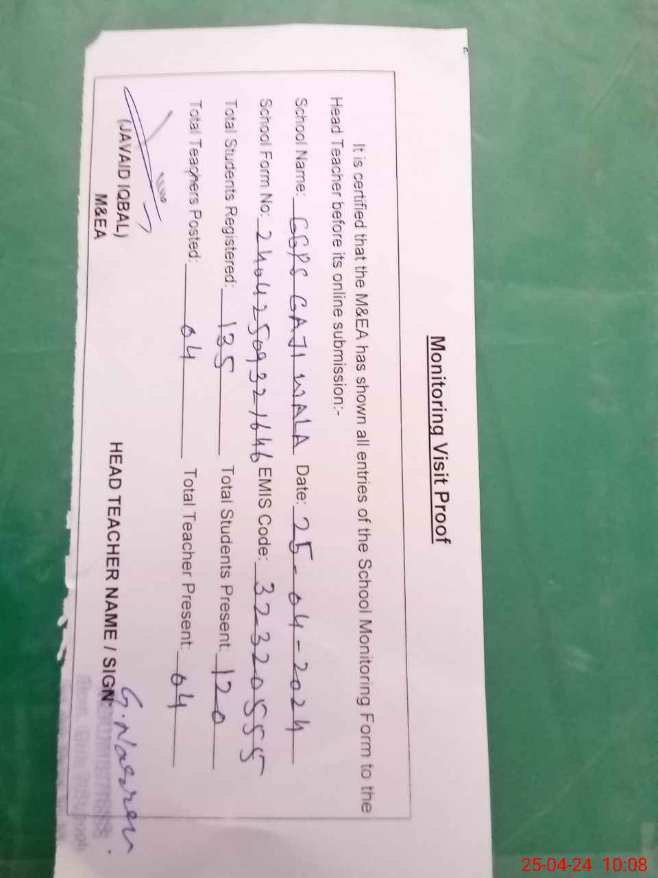 | Attendance Register | Head Teacher | MEA with School | Visit Proof |