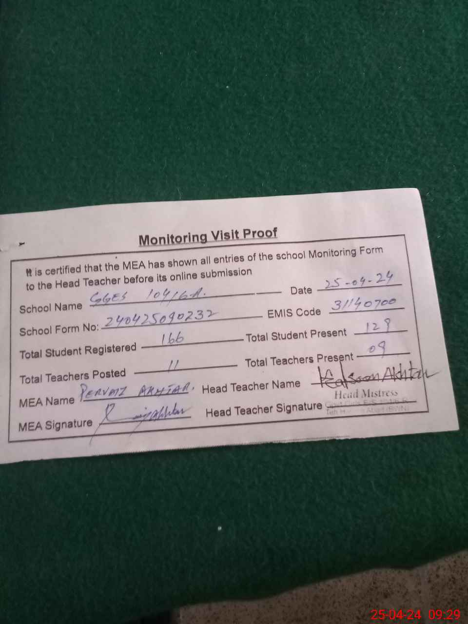 | Attendance Register | Head Teacher | MEA with School | Visit Proof |