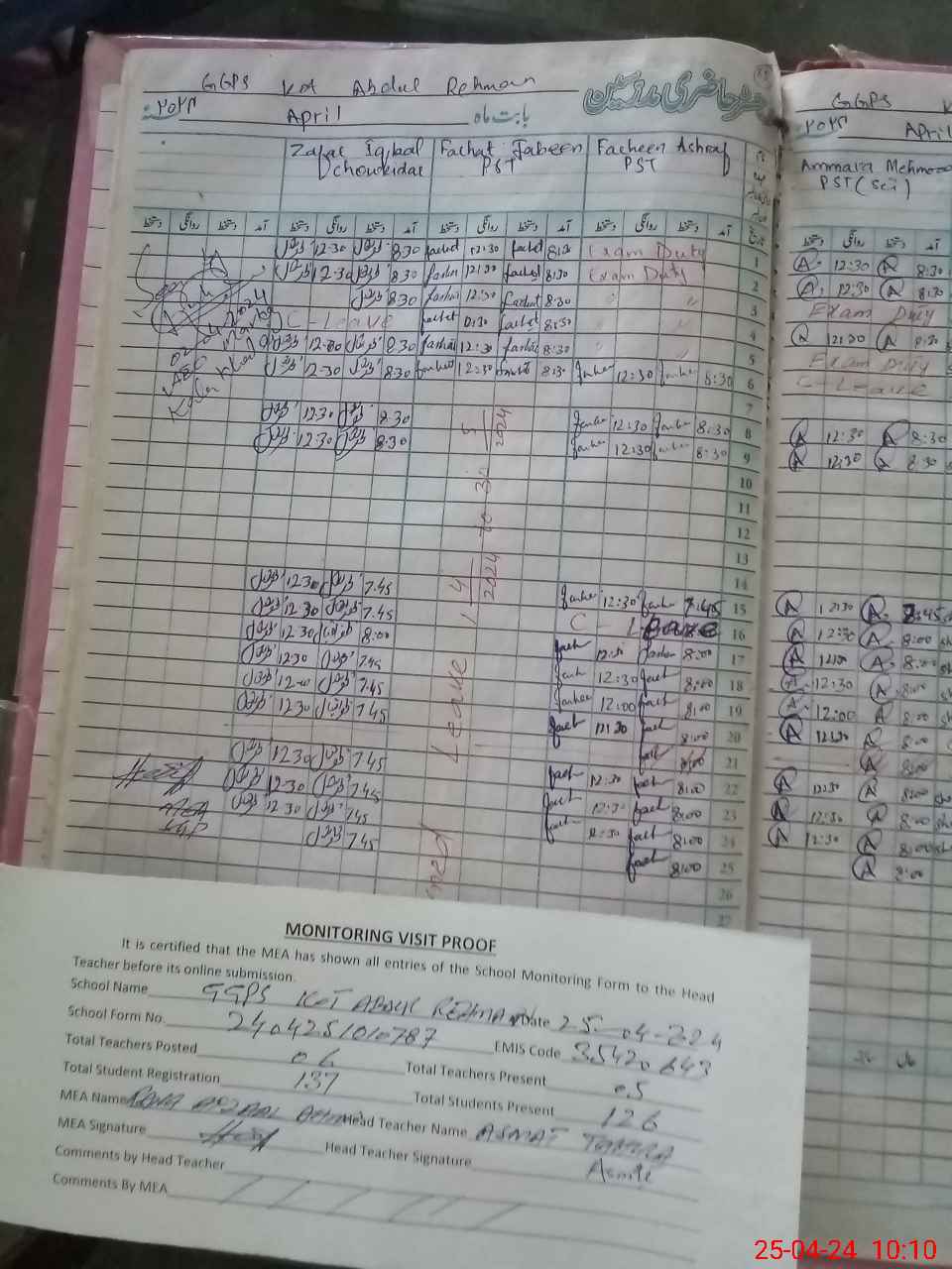 | Monitoring Date: 25-04-2024 | Start Time: 25-04-2024 09:34 AM | End Time: 25-04-2024 10:11 AM | Name of MEA: Ra**** Af**** Ah**** (R**** 25**** | |