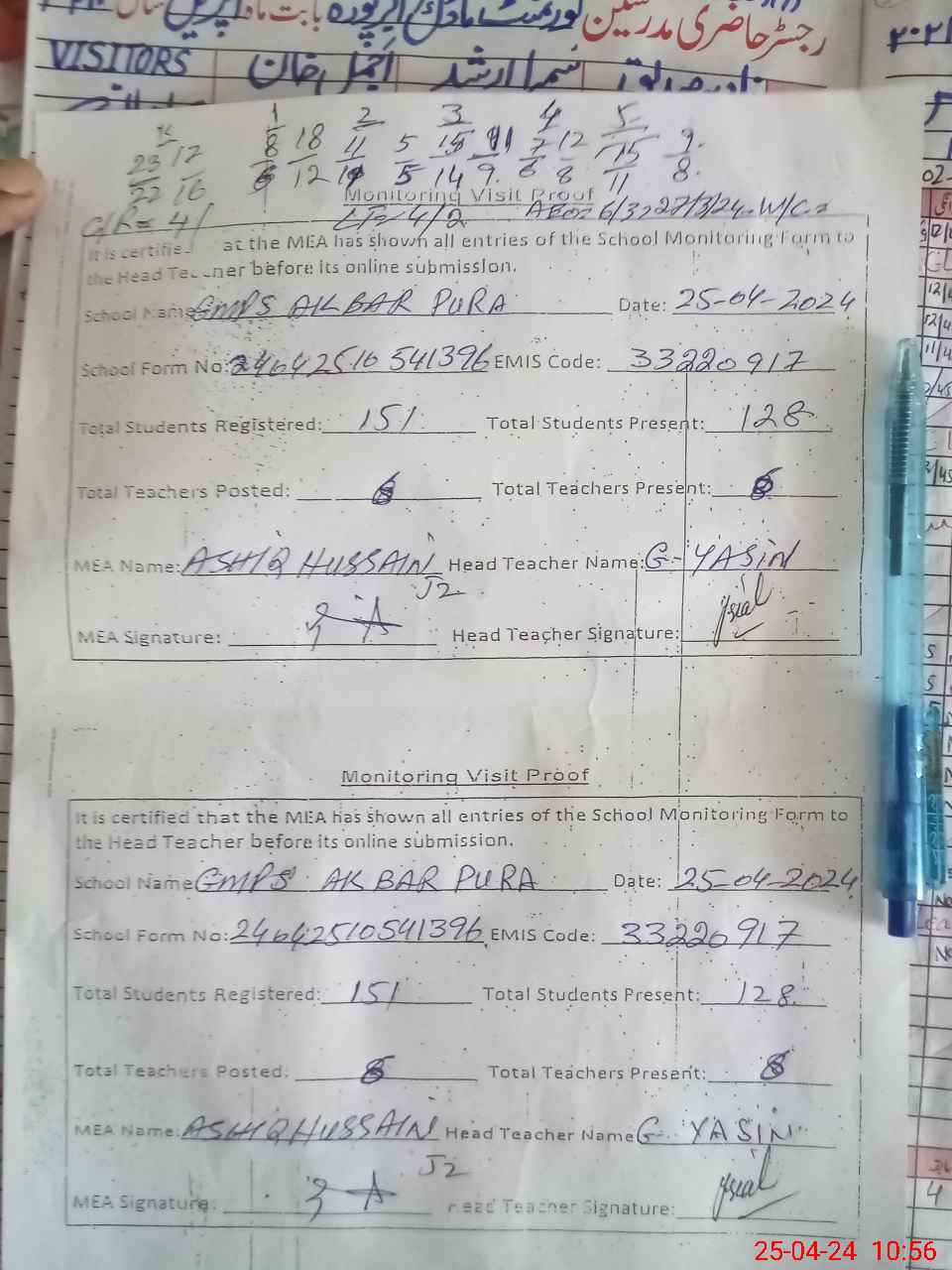 | Attendance Register | Head Teacher | MEA with School | Visit Proof |