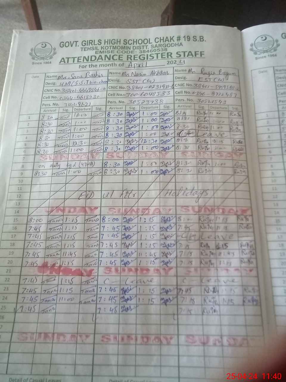 | Name: SA**** BA**** Designation: (School Headmaster's/Headmistress's) SST SCIENCE (HEADMISTRESS) Phone/Cell Number: 03**** |