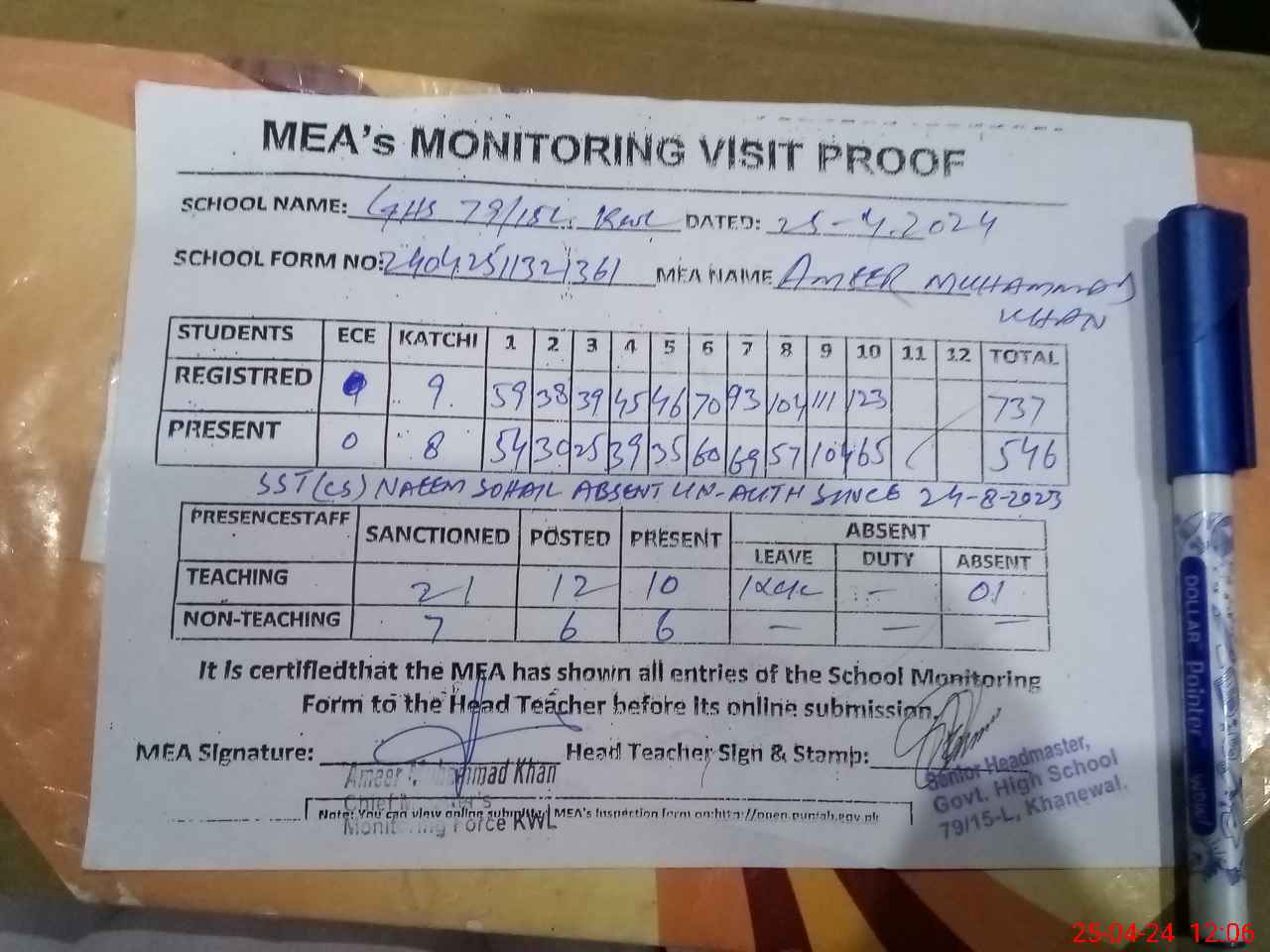 | Attendance Register | Head Teacher | MEA with School | Visit Proof |