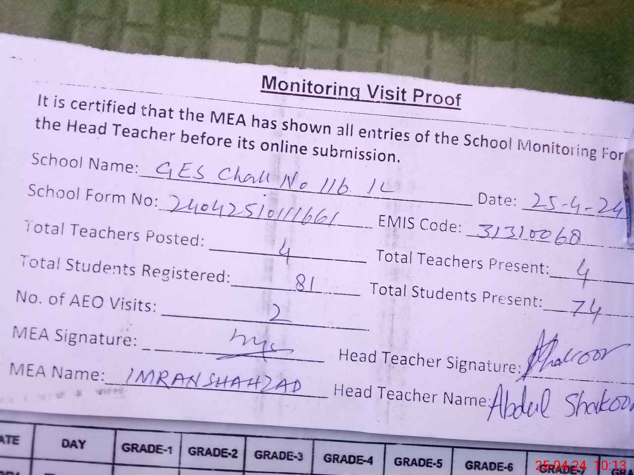| Attendance Register | Head Teacher | MEA with School | Visit Proof |