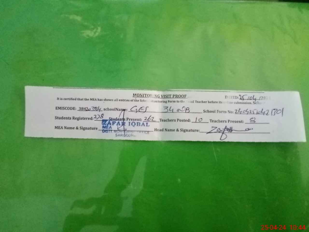 | Attendance Register | Head Teacher | MEA with School | Visit Proof |