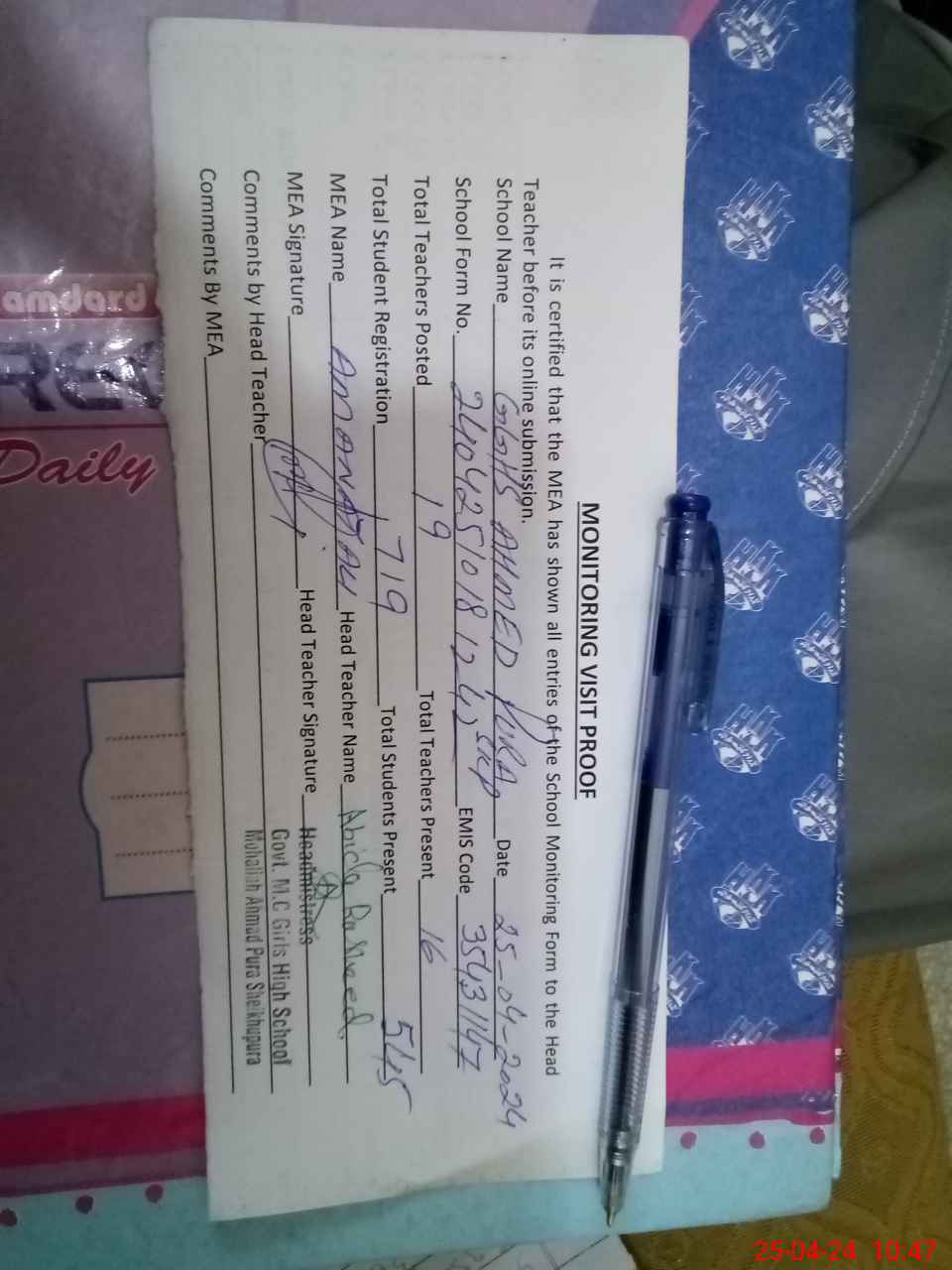 | Attendance Register | Head Teacher | MEA with School | Visit Proof |