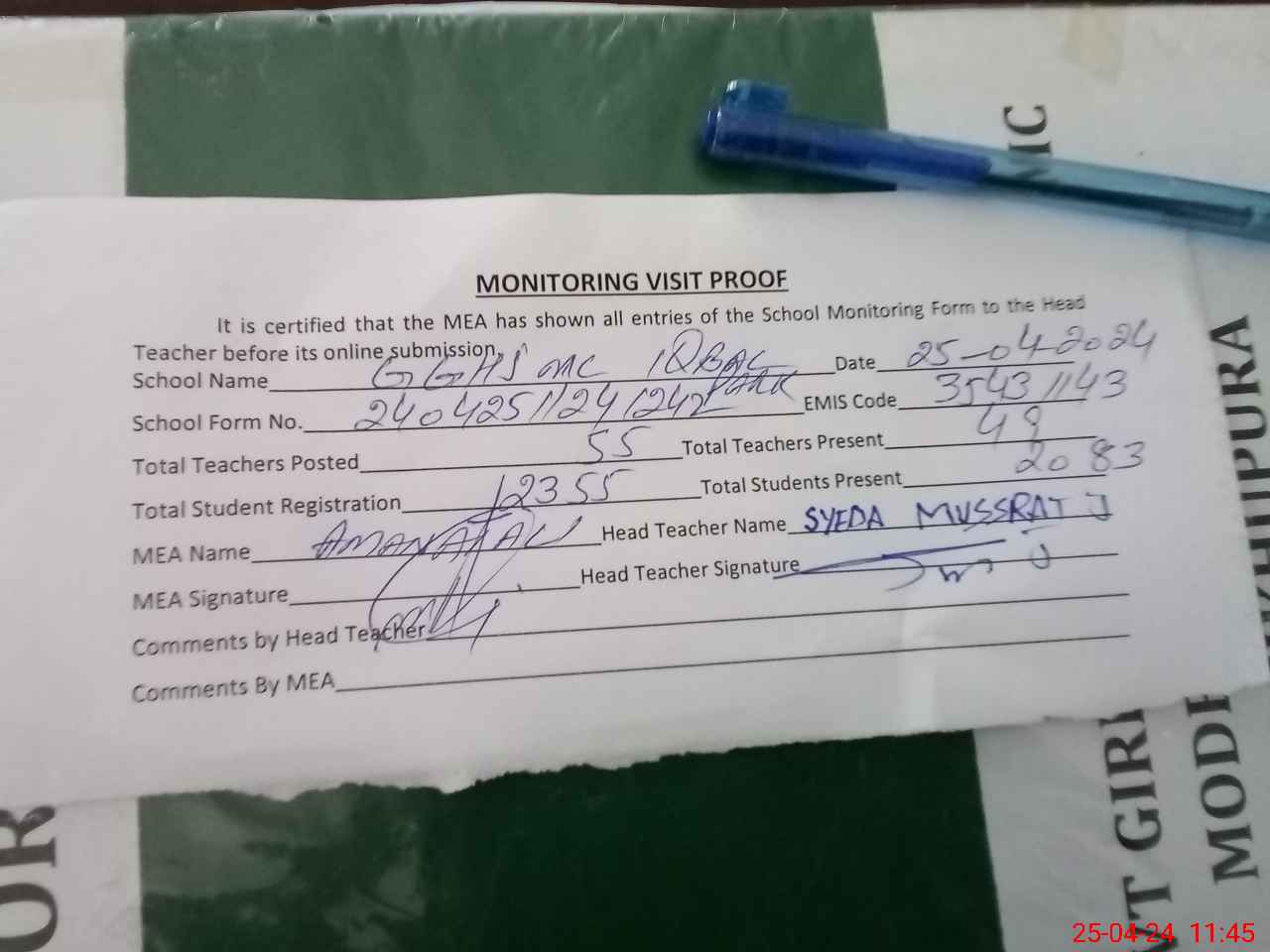 | Attendance Register | Head Teacher | MEA with School | Visit Proof |