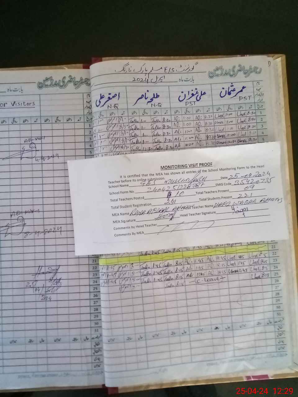 | Attendance Register | Head Teacher | MEA with School | Visit Proof |