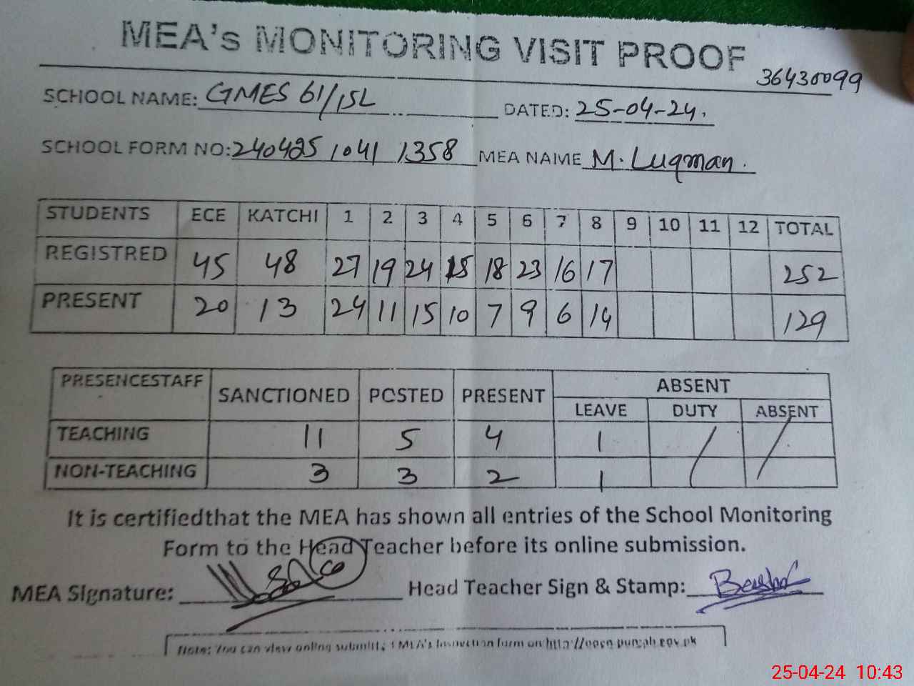 | Attendance Register | Head Teacher | MEA with School | Visit Proof |