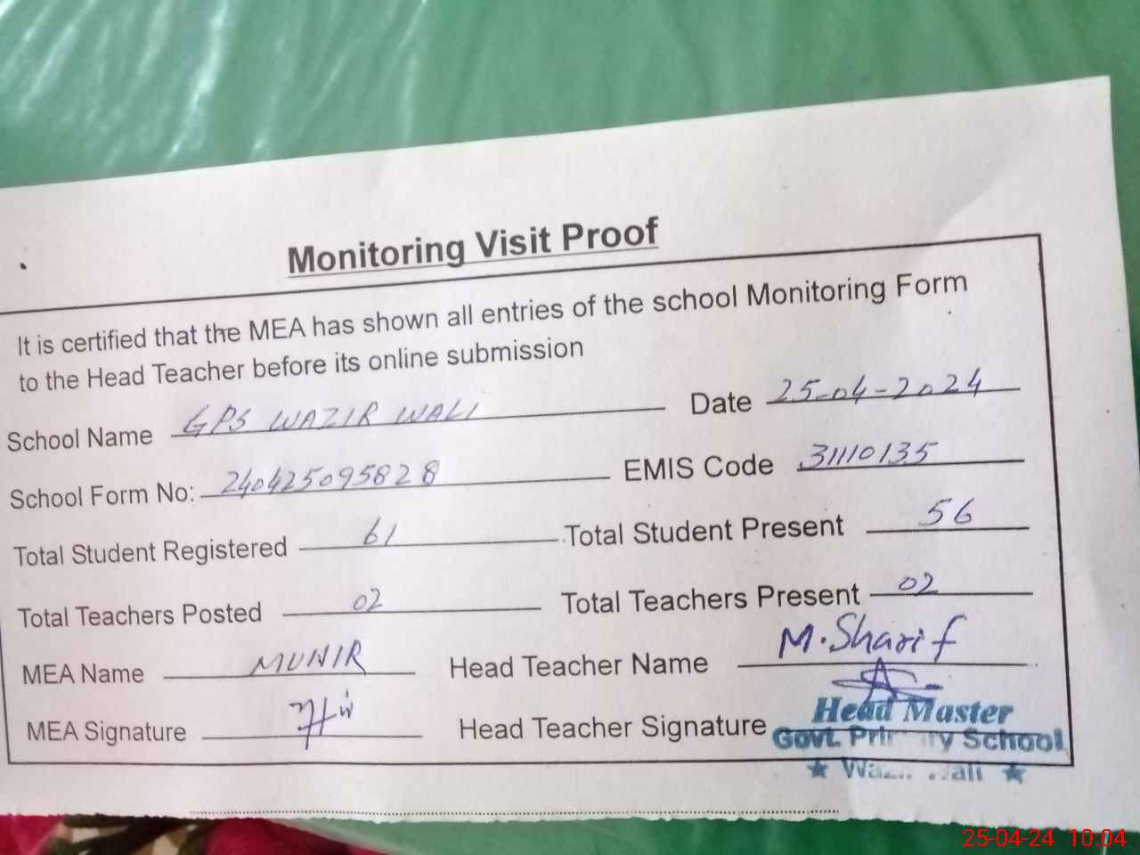 | EMIS Code: 31110135 | Name of School: GPS WAZIR WALI | |||