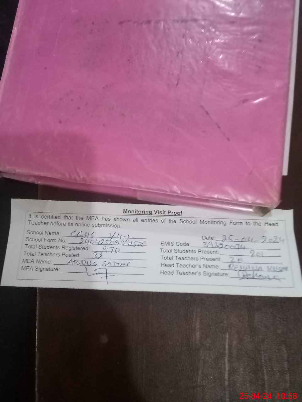 | Attendance Register | Head Teacher | MEA with School | Visit Proof |