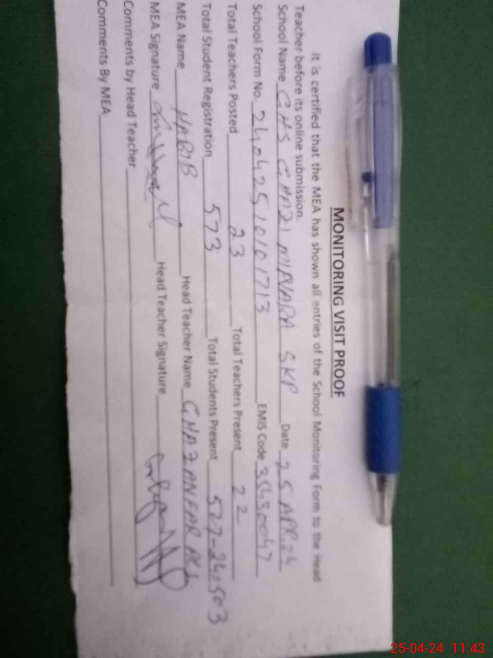 | Attendance Register | Head Teacher | MEA with School | Visit Proof |