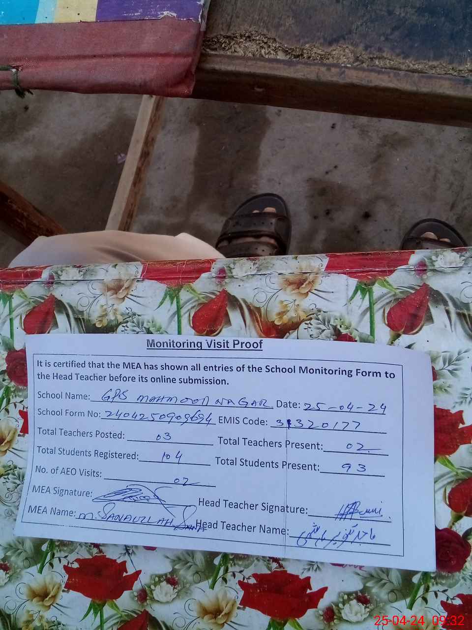 | Monitoring Date: 25-04-2024 | Start Time: 25-04-2024 09:09 AM | End Time: 25-04-2024 09:32 AM | Name of MEA: Mu**** Sa**** Ul**** Sa**** | |