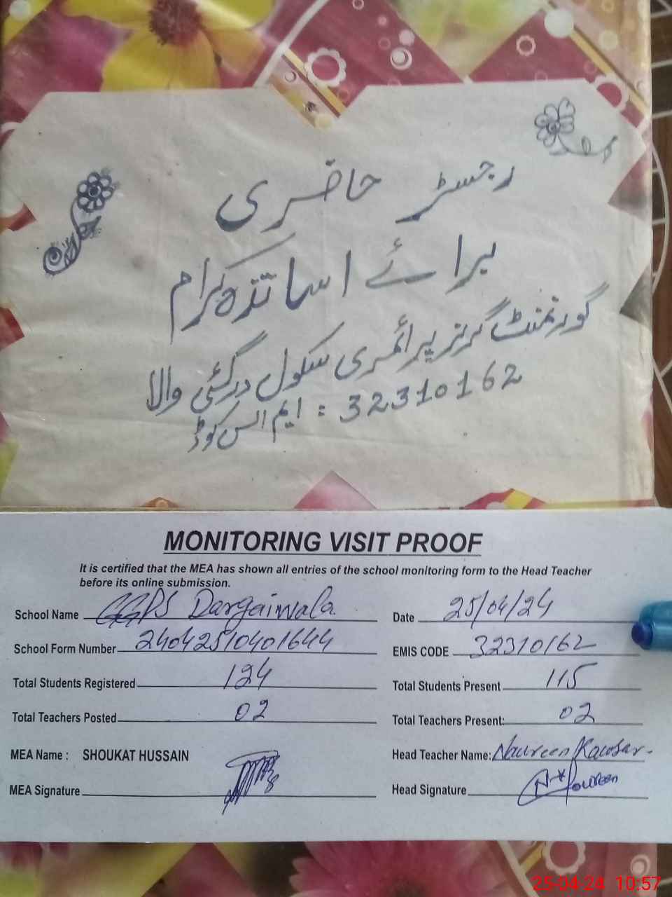 | EMIS Code: 32310162 | Name of School: GGPS DARGHAI WALA | |||