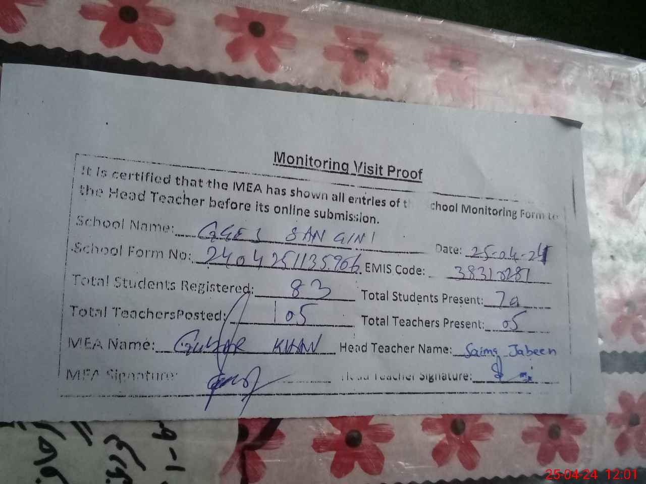 | Attendance Register | Head Teacher | MEA with School | Visit Proof |