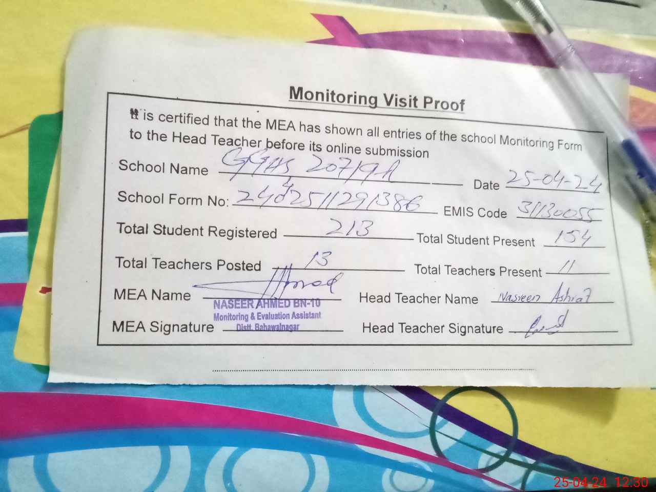 | Attendance Register | Head Teacher | MEA with School | Visit Proof |