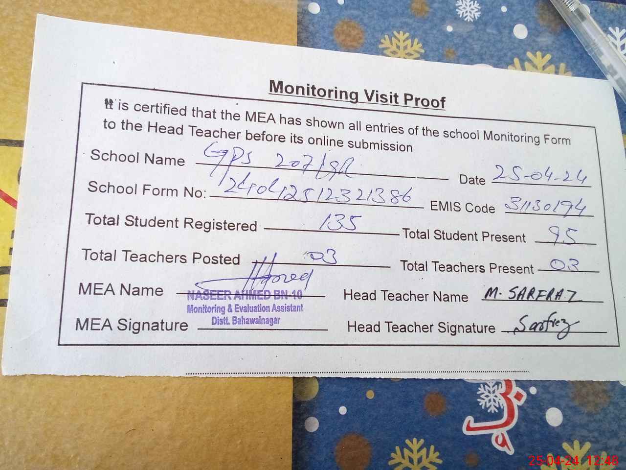 | Attendance Register | Head Teacher | MEA with School | Visit Proof |