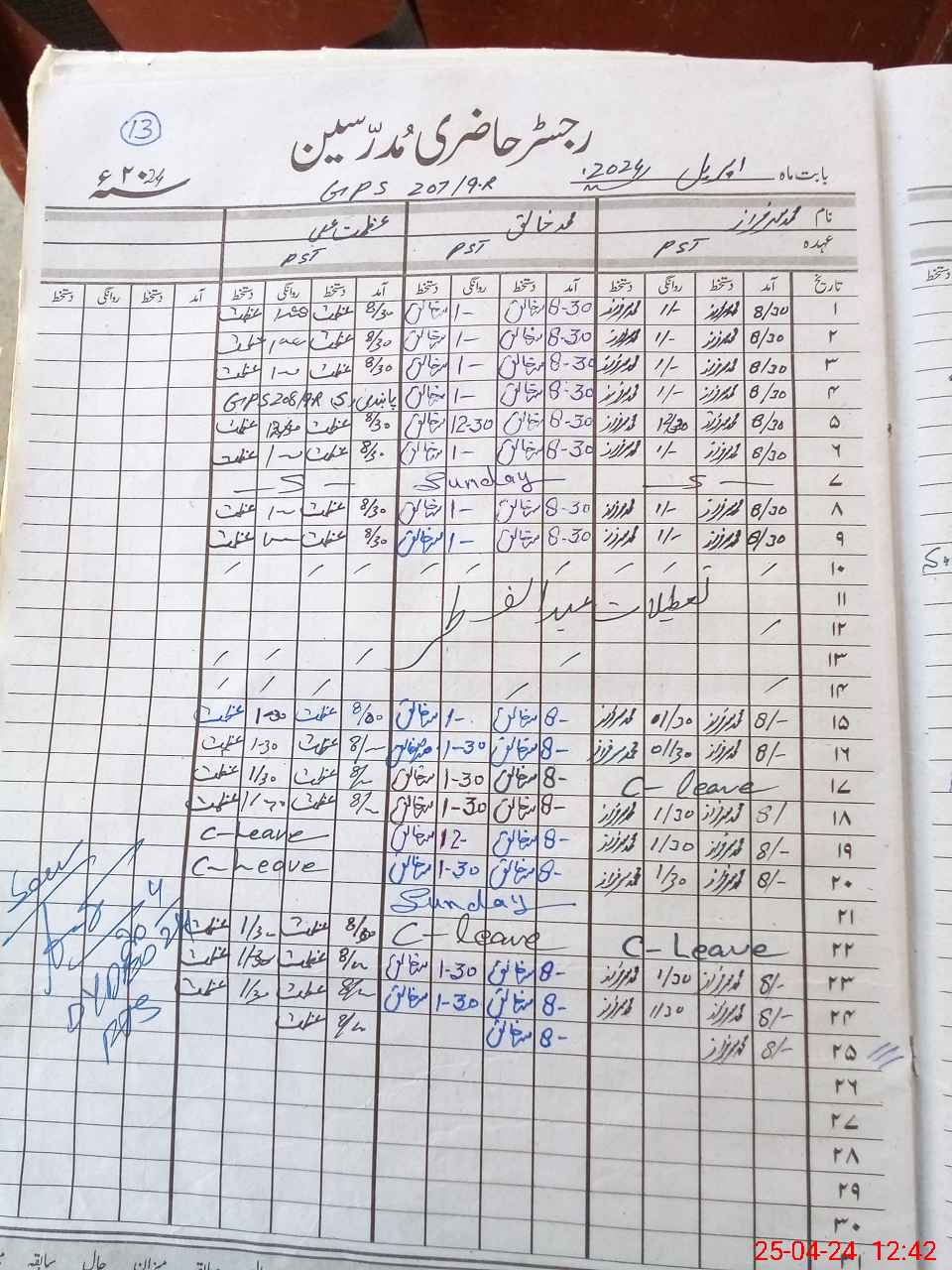 | CNIC | Full Name | Designation | R/C | Absence During Last Calender Month |