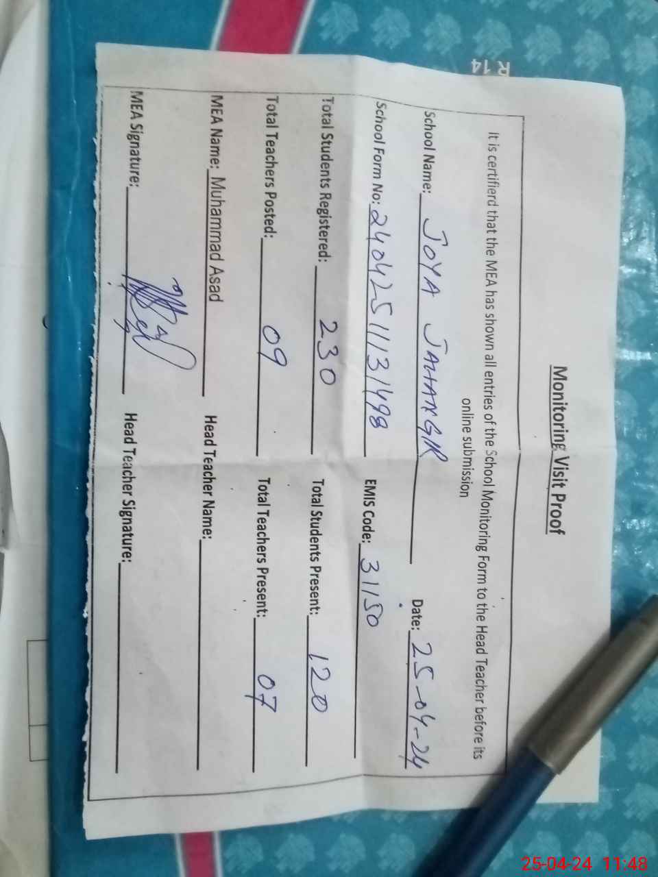 | Remarks (Use Separate Page if Required): Head teacher did not sign the visit proof due to very low students attendance | |||||