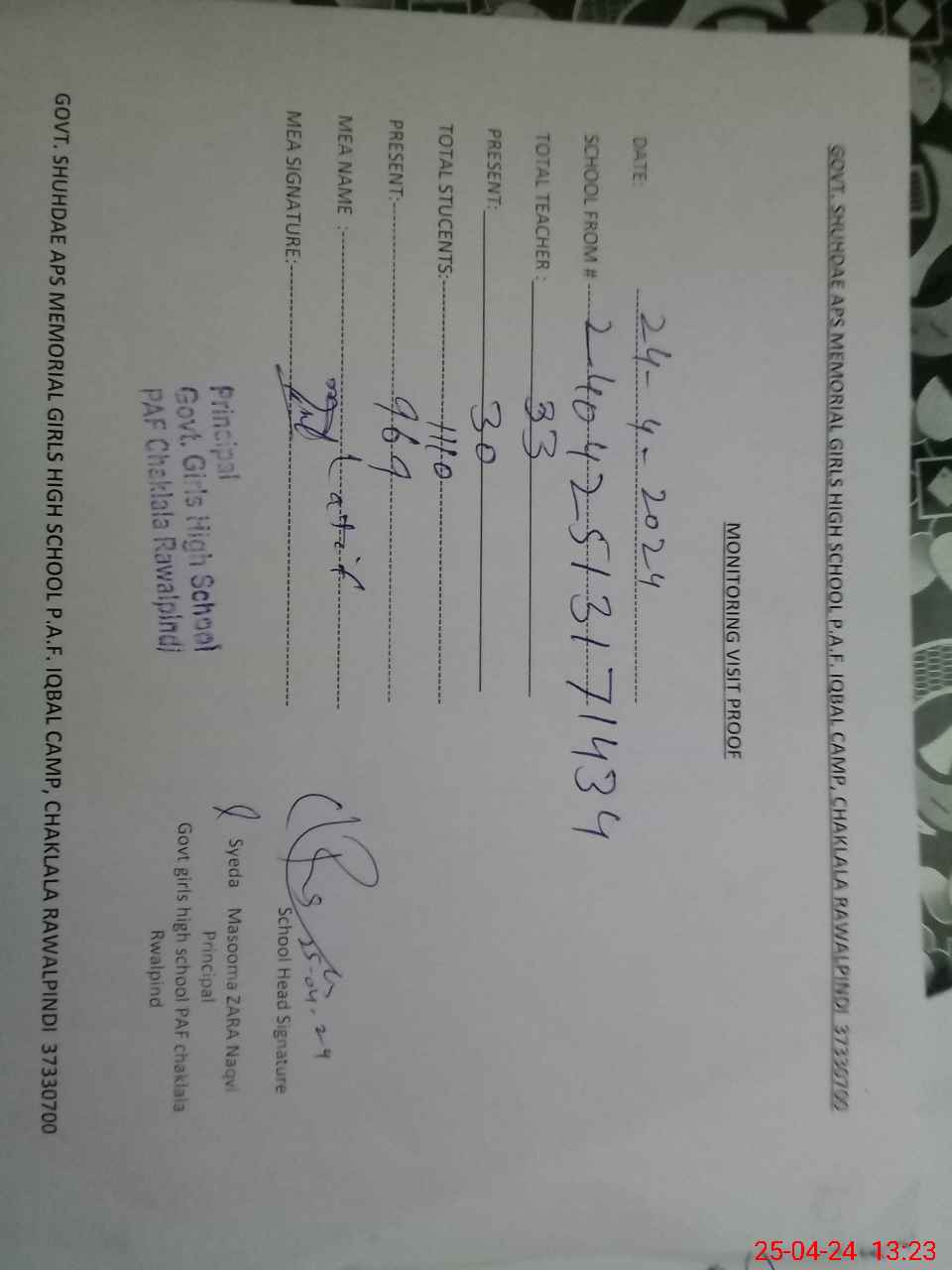 | EMIS Code: 37330700 | Name of School: GGHS PAF BASE CHAKLALA | |||