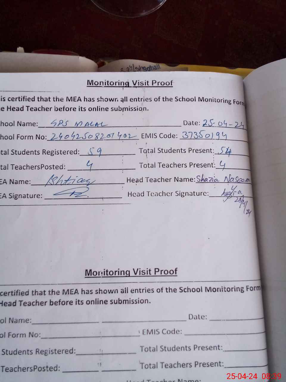 | Attendance Register | Head Teacher | MEA with School | Visit Proof |
