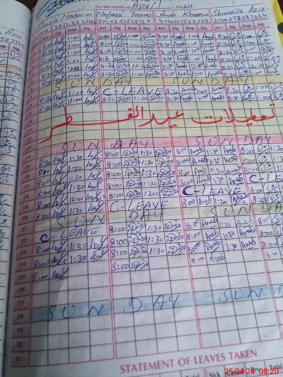 | CNIC | Full Name | Designation | R/C | Absence During Last Calender Month |