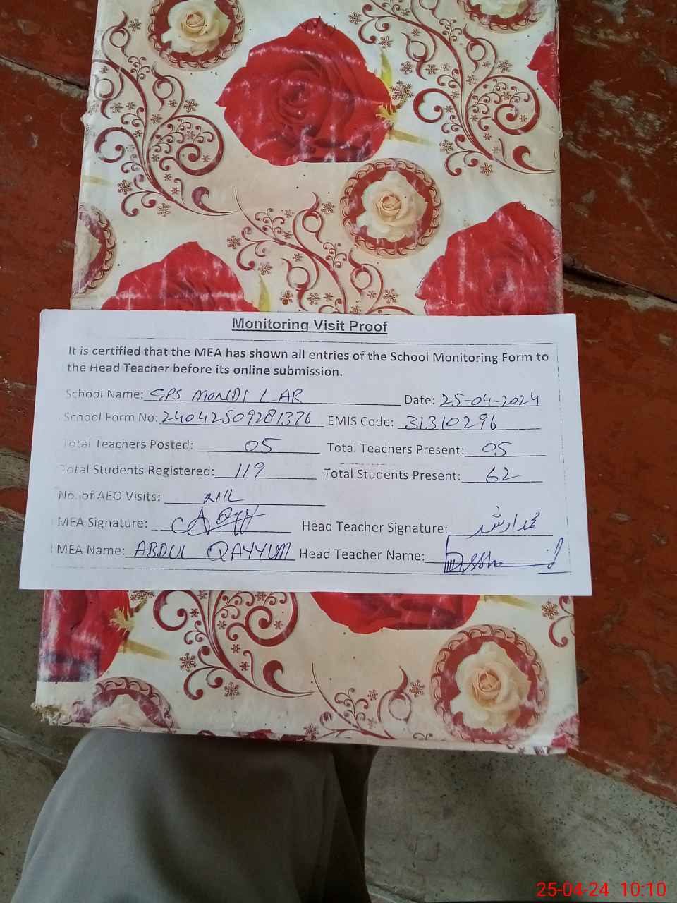 | Attendance Register | Head Teacher | MEA with School | Visit Proof |