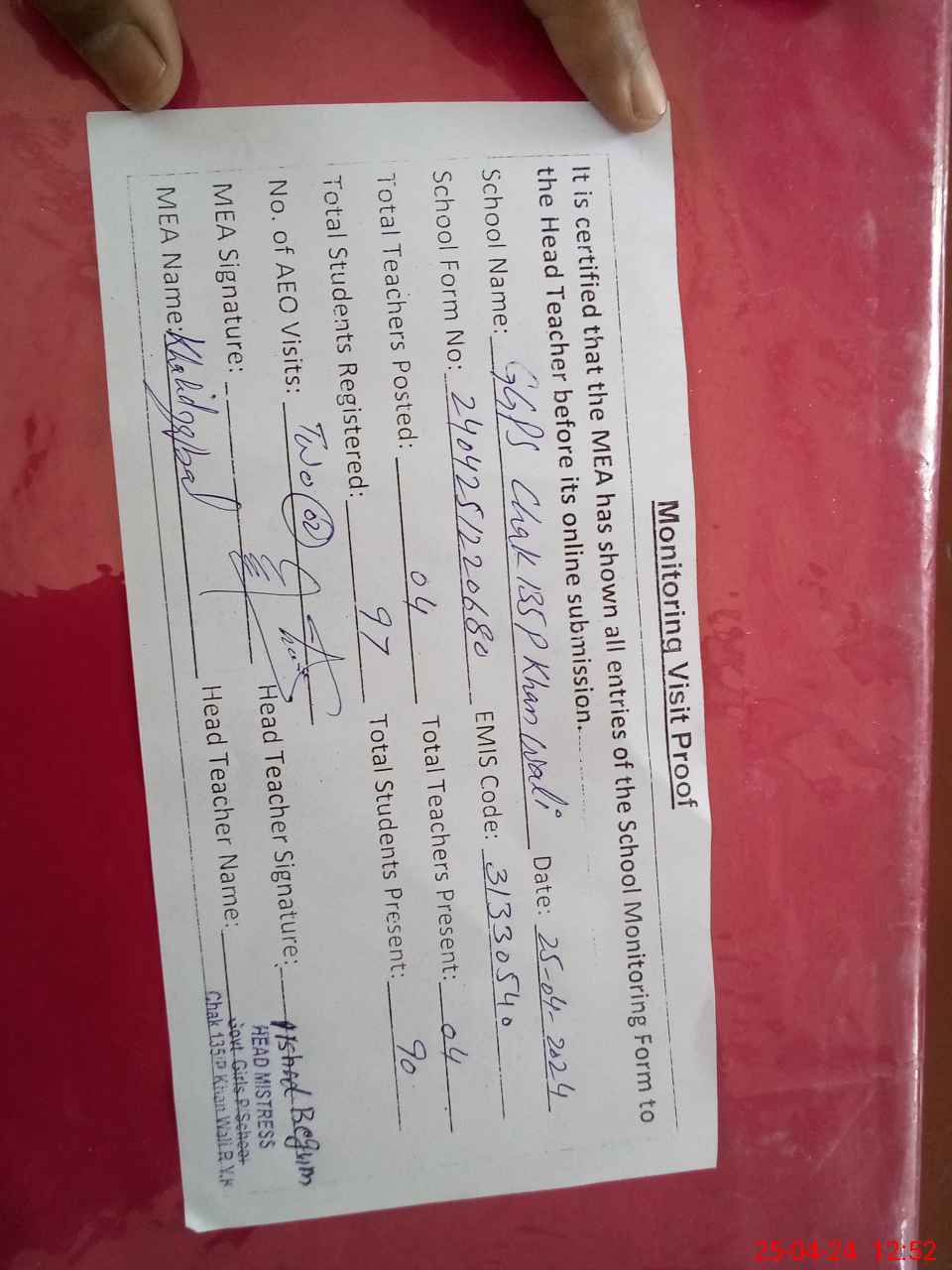 | Attendance Register | Head Teacher | MEA with School | Visit Proof |