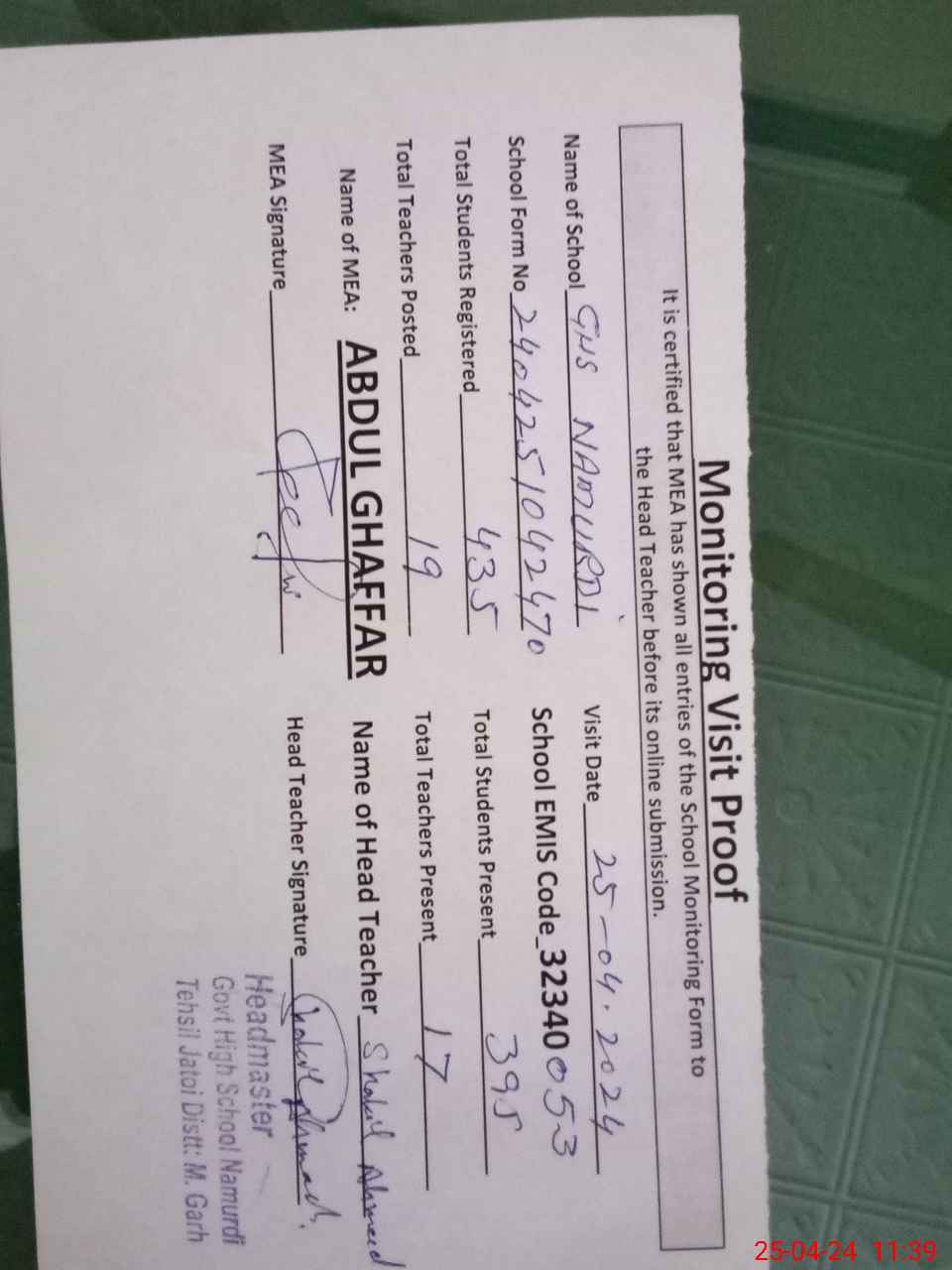 | Attendance Register | Head Teacher | MEA with School | Visit Proof |