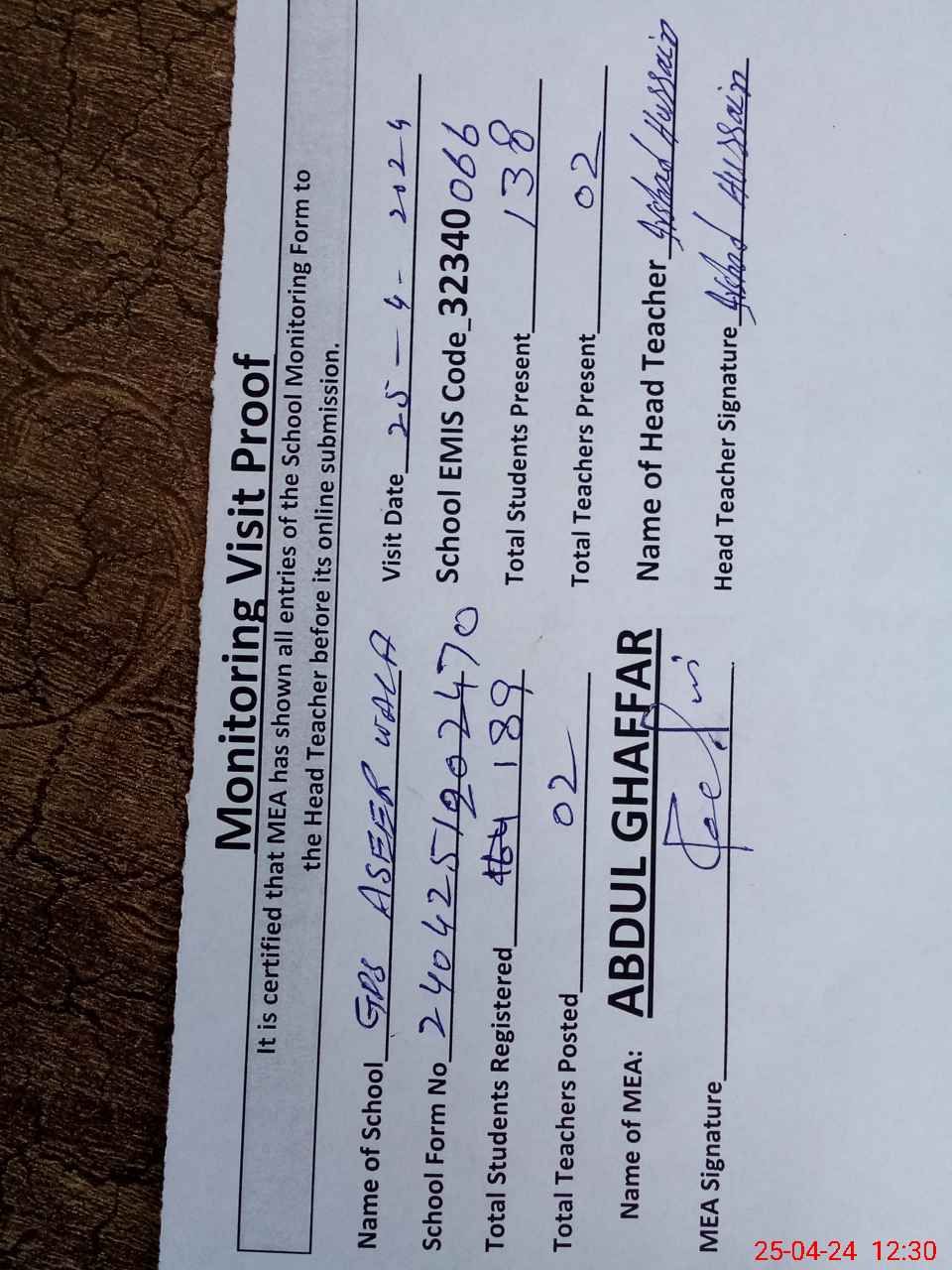| Attendance Register | Head Teacher | MEA with School | Visit Proof |