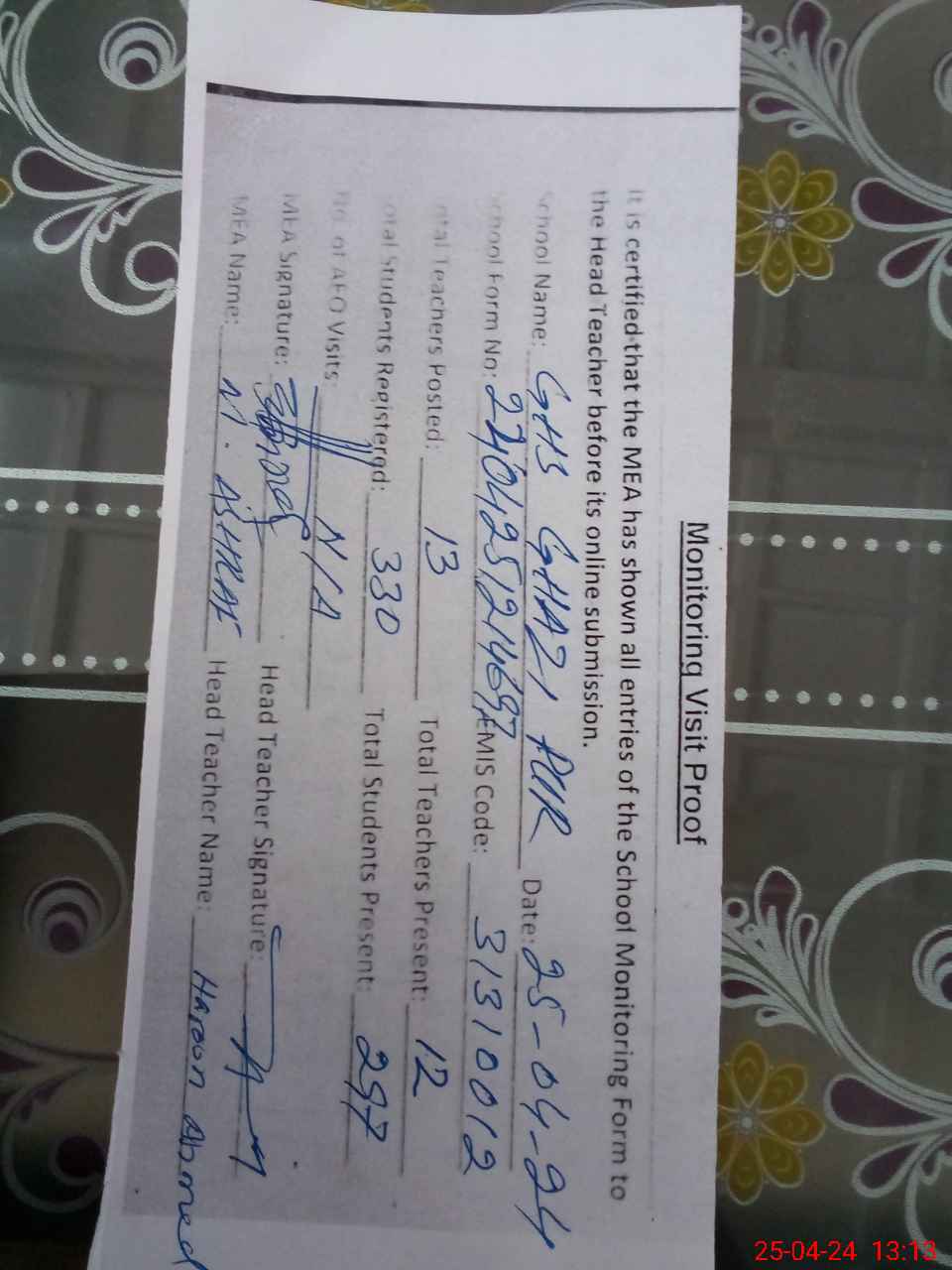 | EMIS Code: 31310012 | Name of School: GHS GHAZI PUR | |||