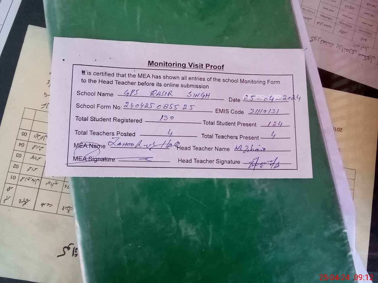 | Attendance Register | Head Teacher | MEA with School | Visit Proof |