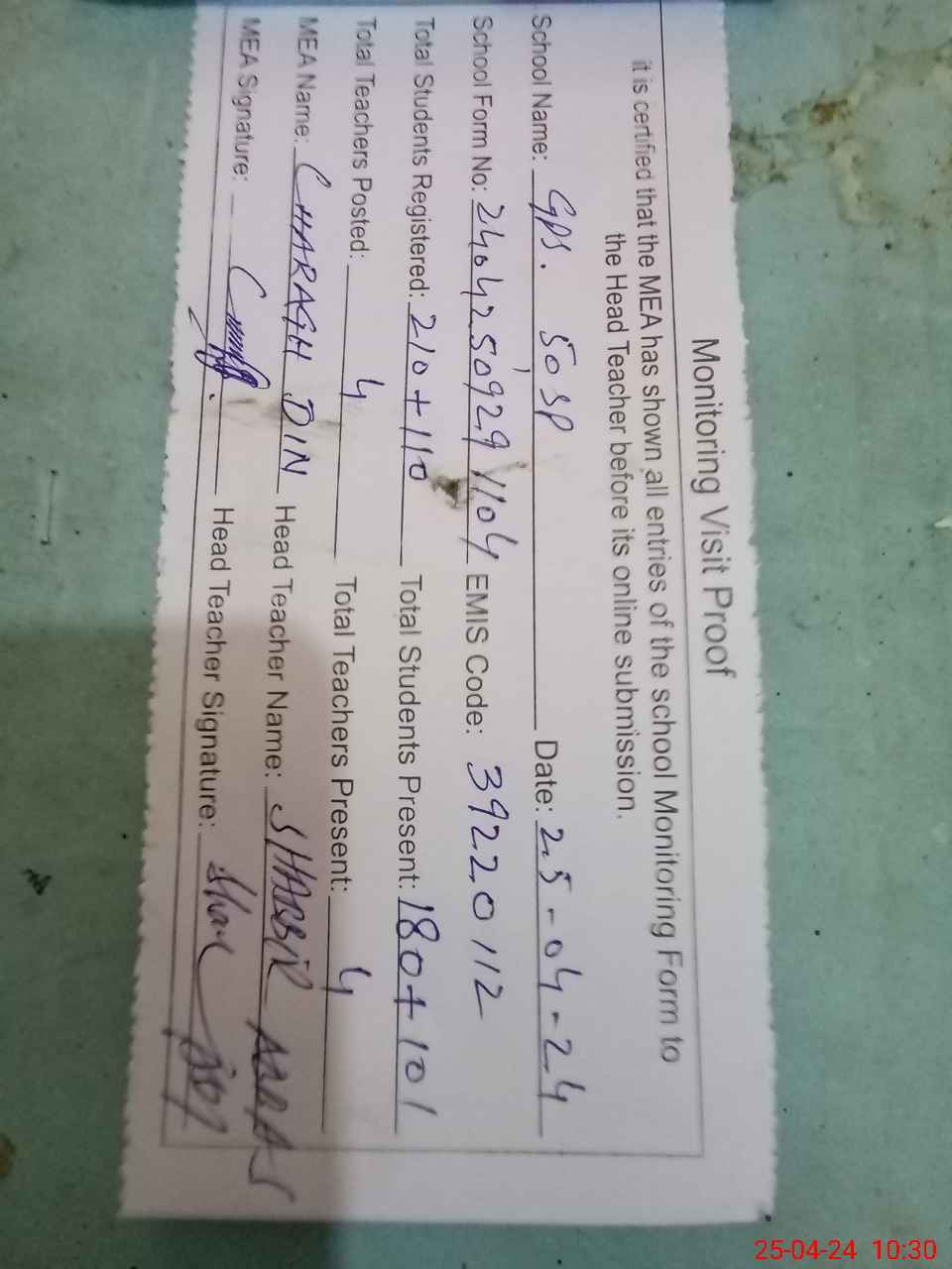 | Attendance Register | Head Teacher | MEA with School | Visit Proof |
