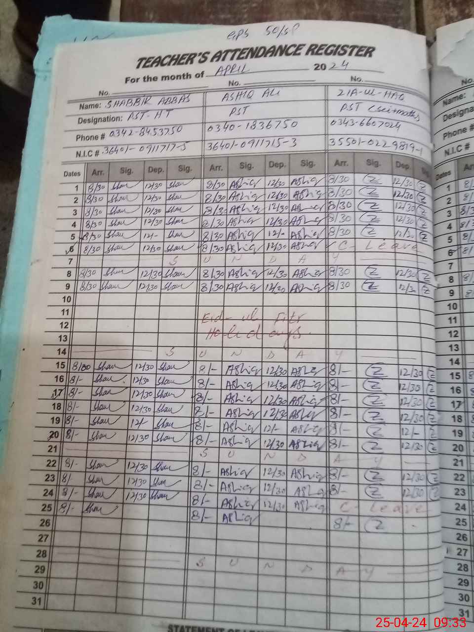| CNIC | Full Name | Designation | R/C | Absence During Last Calender Month |