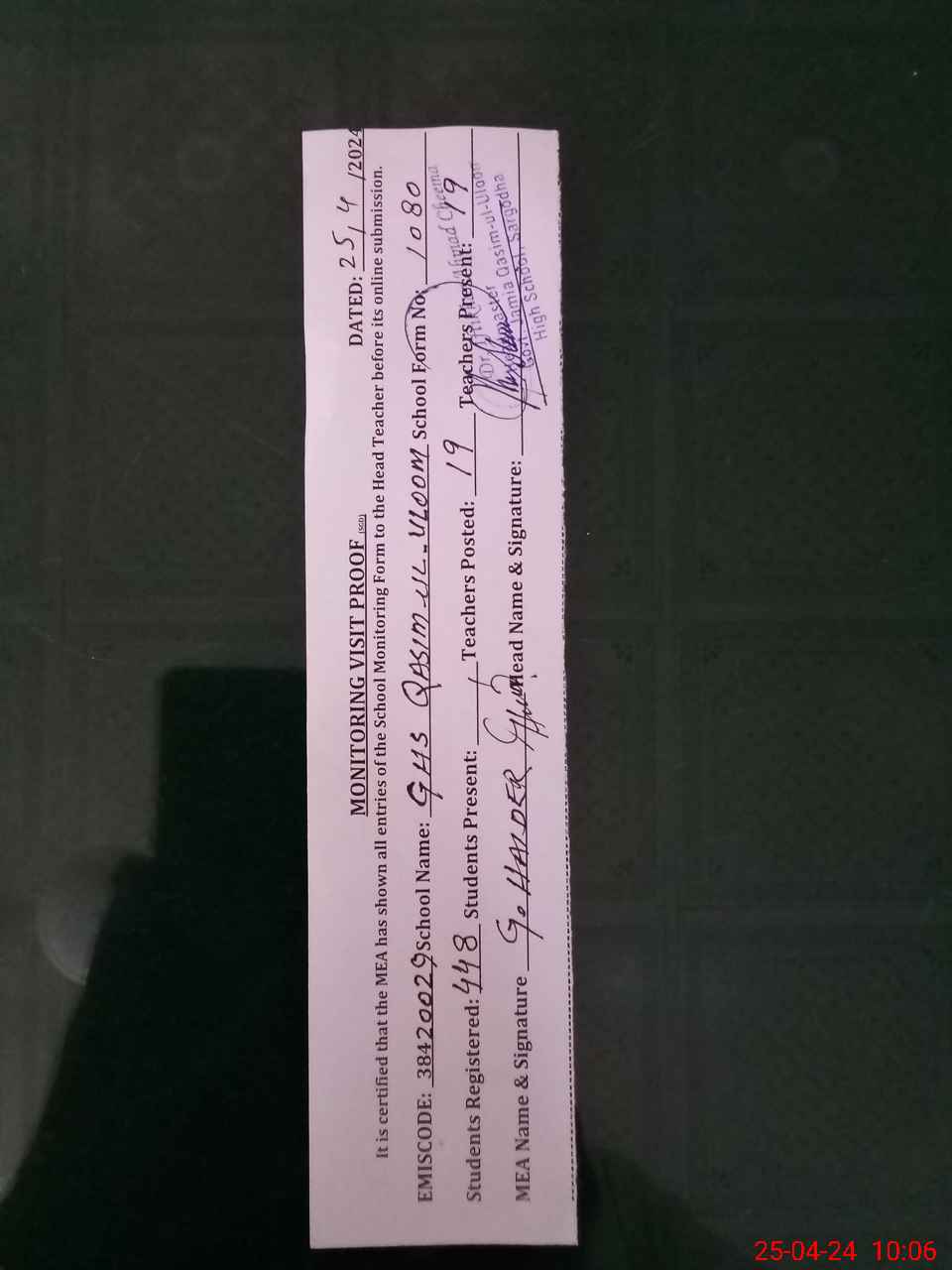 | Certified that this School was Inspected by the Undersigned MEA/DMO Today and the Information Stated Above is as Per Record. | |||||