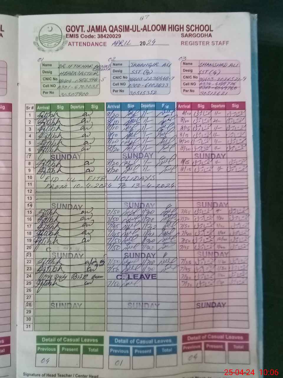 | CNIC | Full Name | Designation | R/C | Absence during last cal. month |