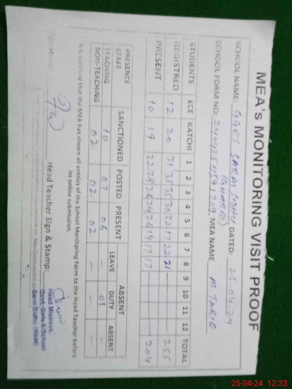 | Attendance Register | Head Teacher | MEA with School | Visit Proof |