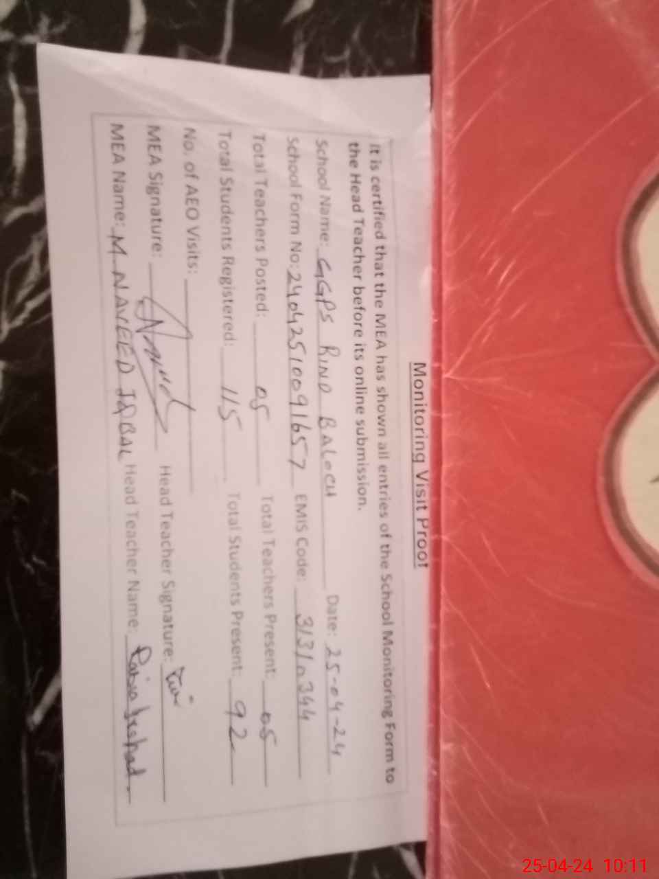 | Attendance Register | Head Teacher | MEA with School | Visit Proof |