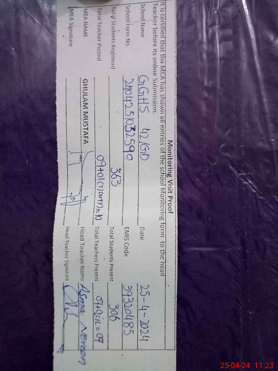 | EMIS Code: 39320485 | Name of School: GGHS 42/G.D | |||
