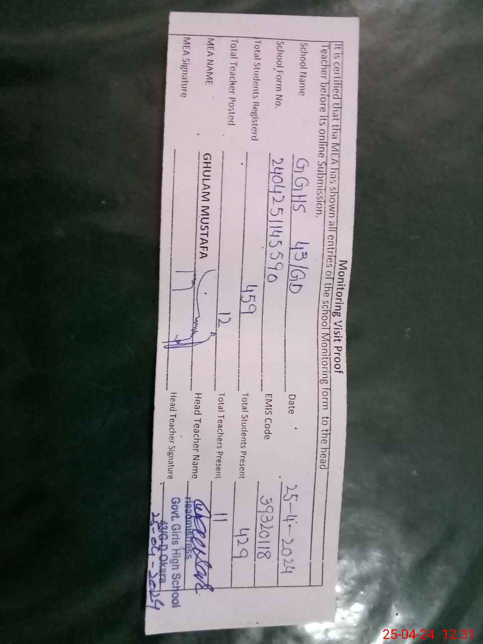 | Certified that this School was Inspected by the Undersigned MEA/DMO Today and the Information Stated Above is as Per Record. | |||||