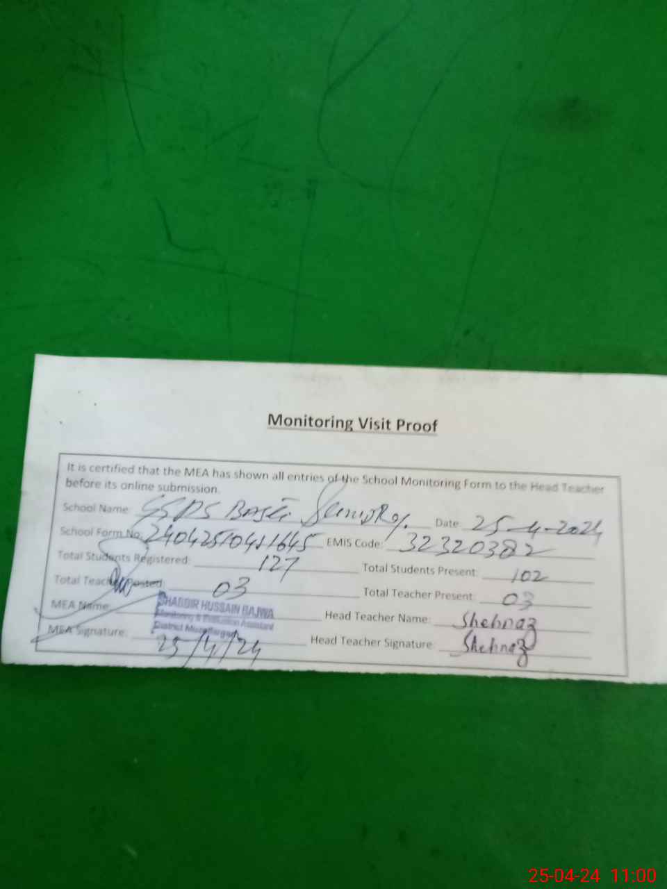 | Attendance Register | Head Teacher | MEA with School | Visit Proof |