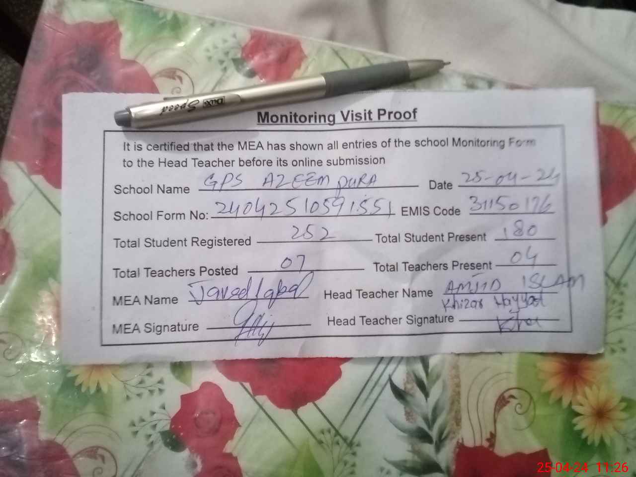 | EMIS Code: 31150176 | Name of School: GPS AZEEM PURA | |||