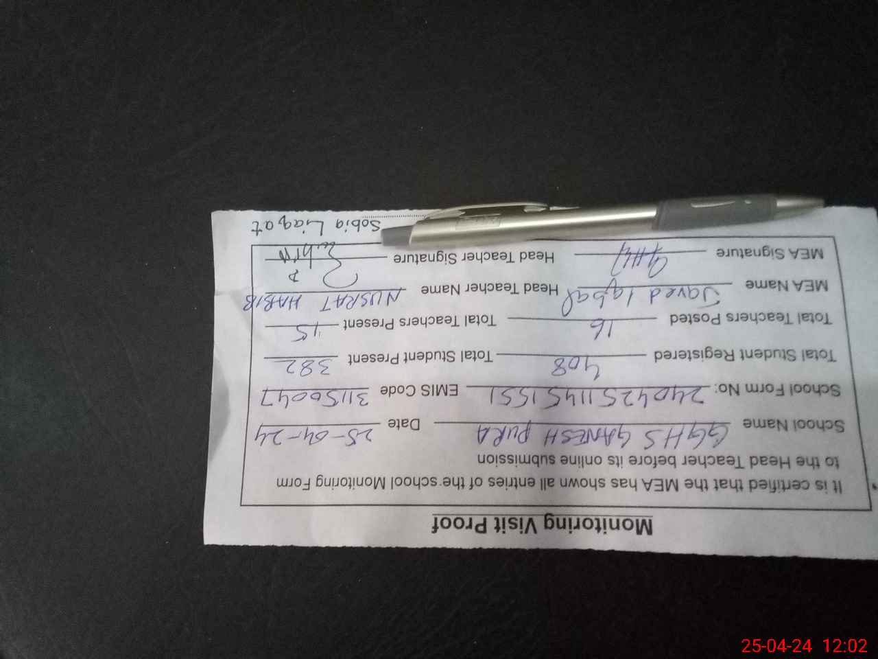 | Certified that this School was Inspected by the Undersigned MEA/DMO Today and the Information Stated Above is as Per Record. | |||||